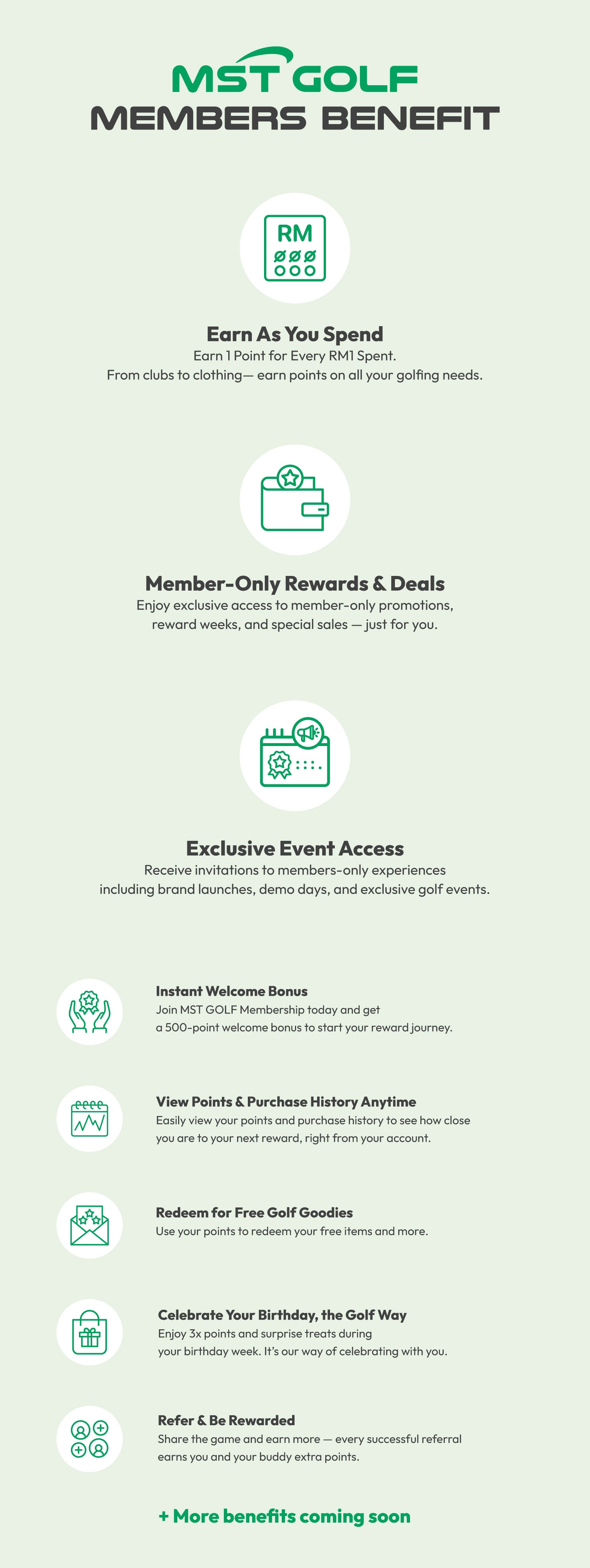 - Earn 1 point for every RM1 spent at MST Golf stores, MST Golf Arena, MST Golf Lab, and mstgolf.com