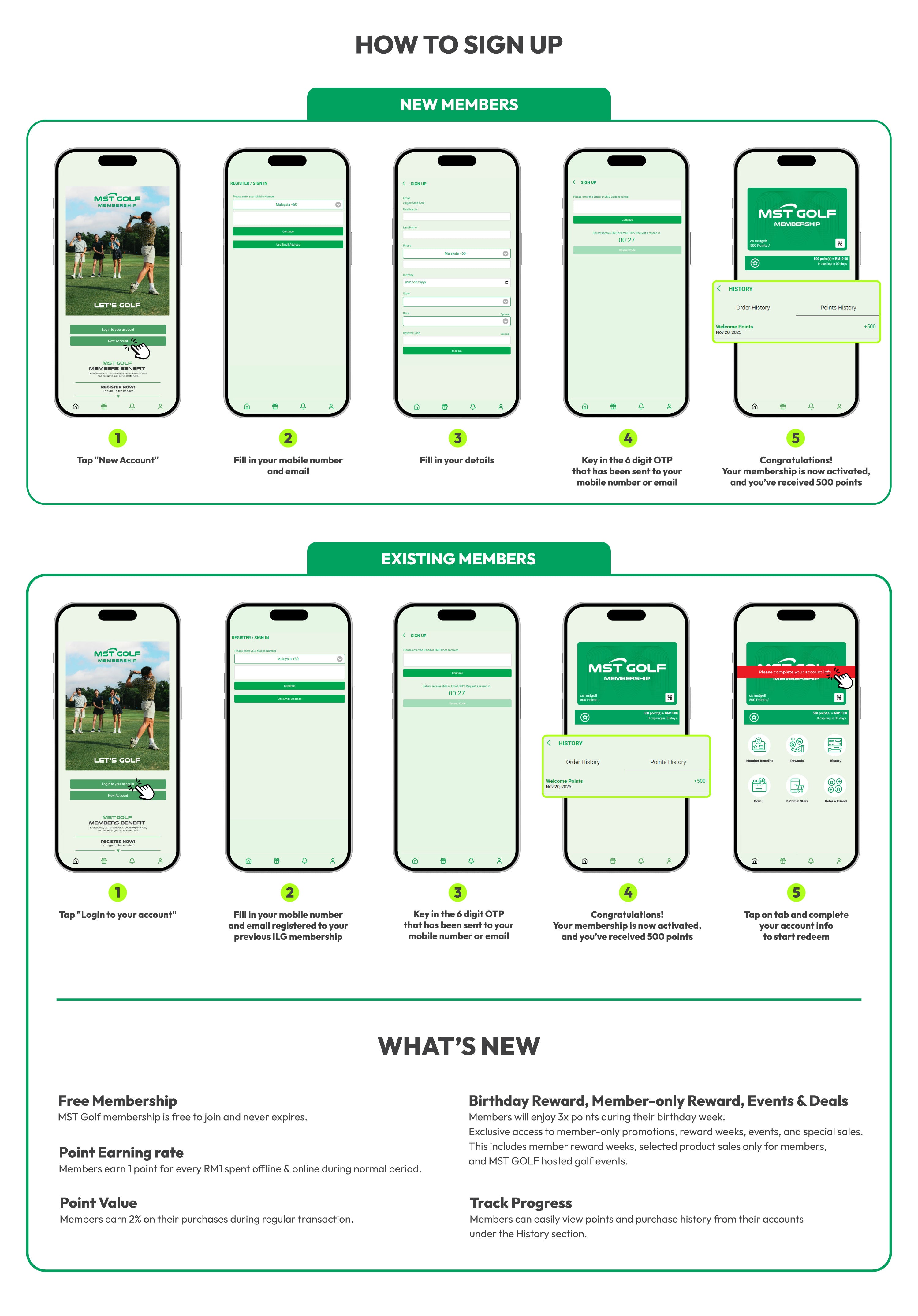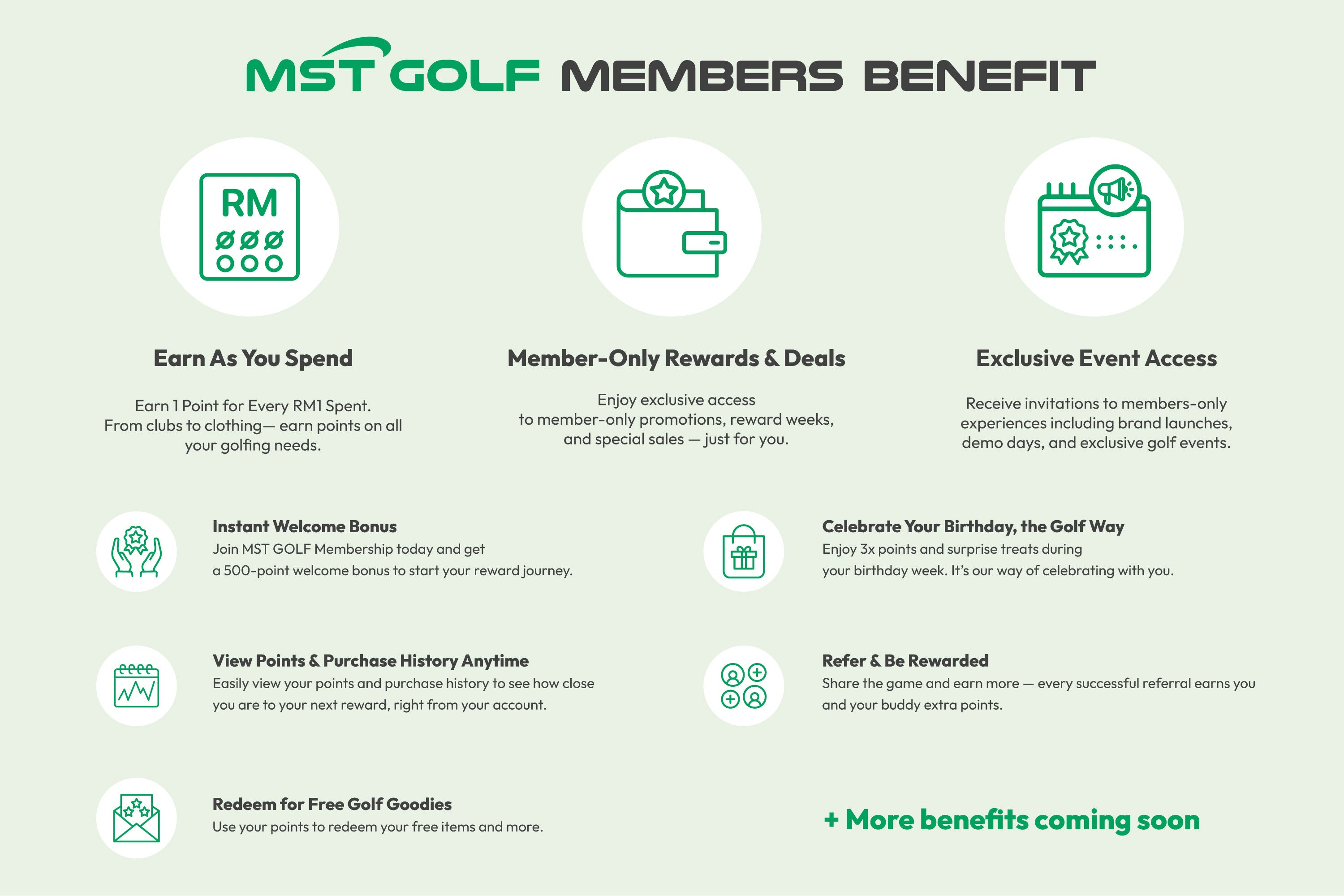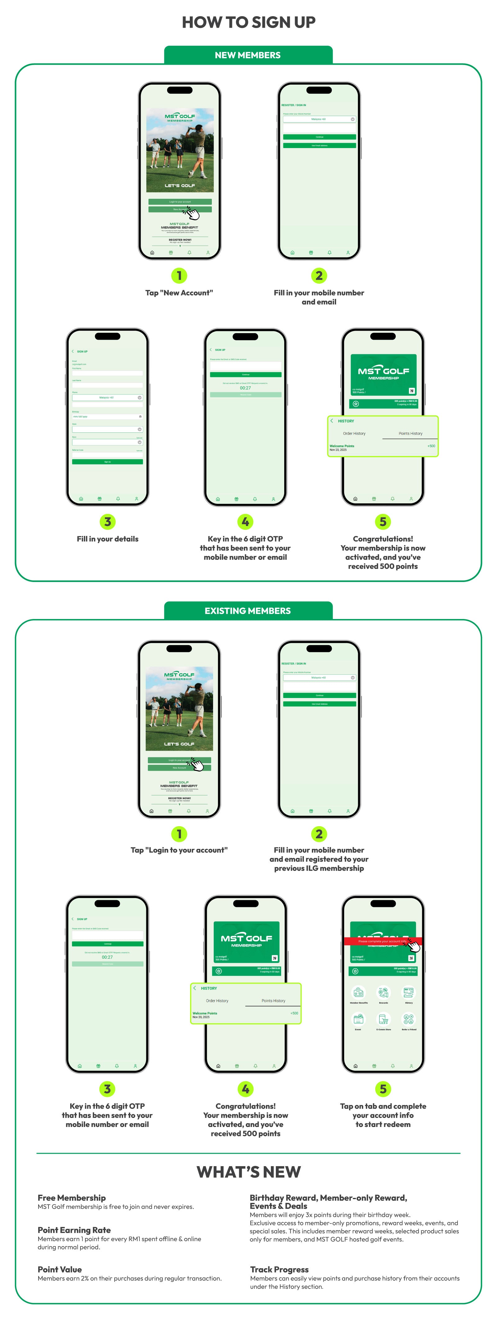 You’ll receive 500 bonus points (equivalent to RM10) after successfully signing into the new MST Golf member portal at http://member.mstgolf.com.